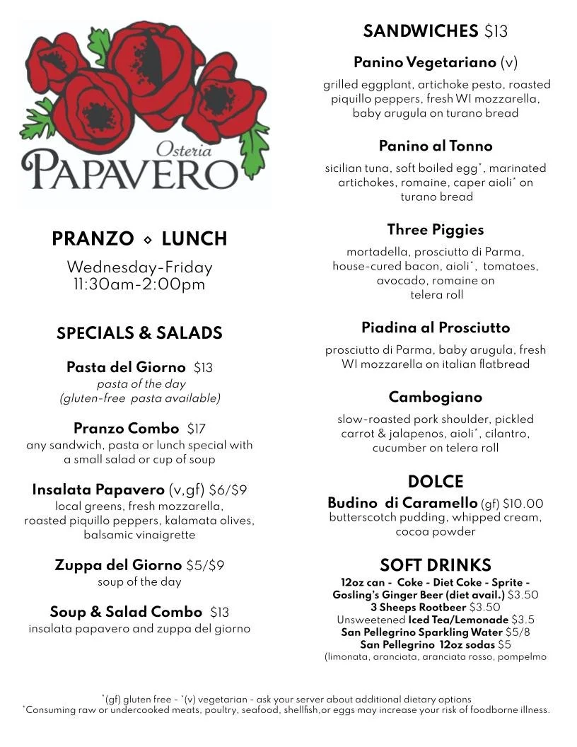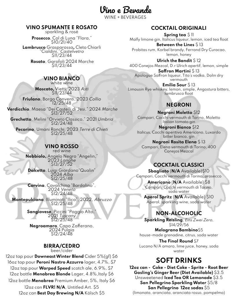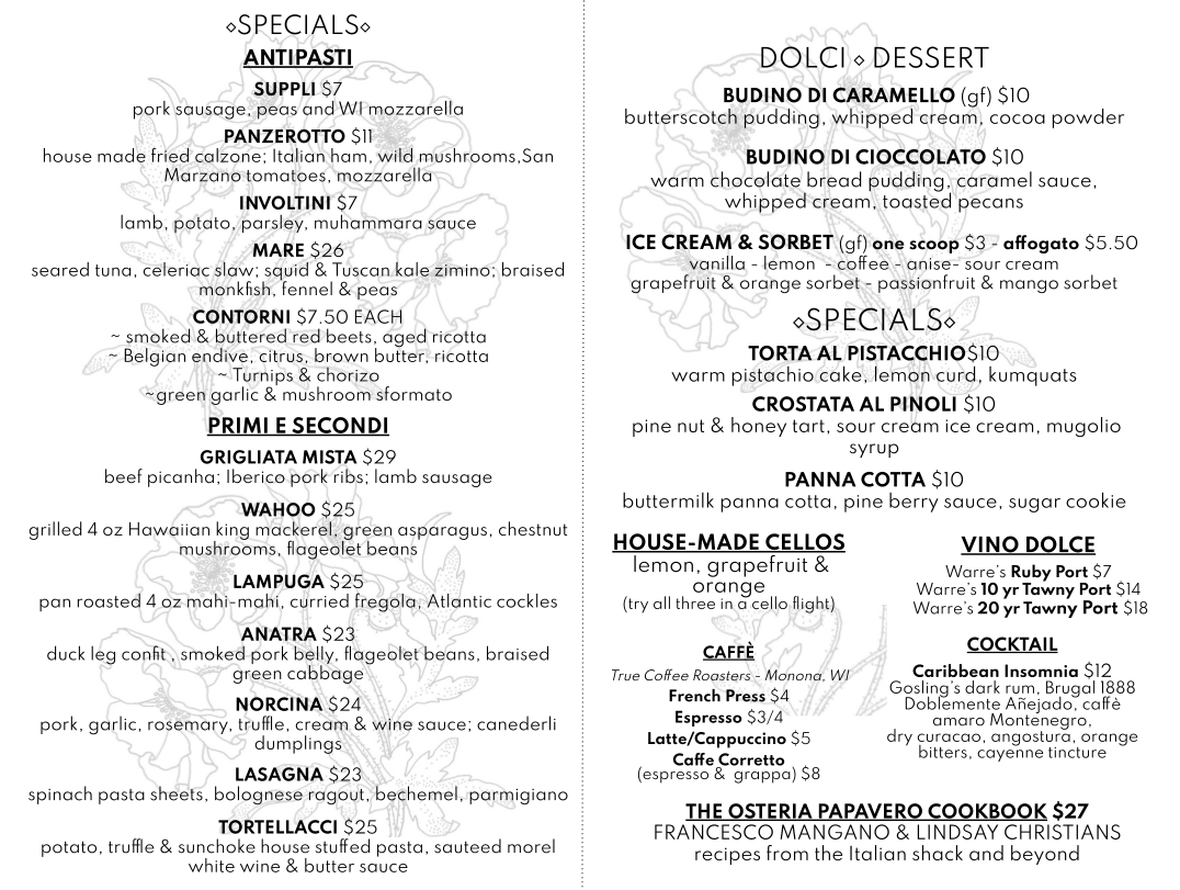 Dinner specials (and verdure, mare & grigliata mista trios) change daily, often multiple times in an evening. All items are subject to availability. Our goal is to run out of the specials each evening so that we may have a whole new menu the next day. Early dining is encouraged & rewarded (with happy hour)!